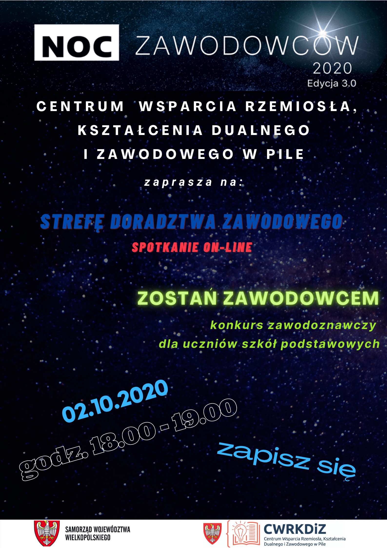Konkurs realizowany jest w dniu: 02.10.2020 roku między 18.00-19.00 dla uczestników wydarzenia Noc Zawodowców 2020 edycja 3.0 pt. „Wielkopolska w sieci zawodów”.Konkurs skierowany jest do uczniów klas VII i VIII szkół podstawowych powiatu chodzieskiego, powiatu czarnkowsko-trzcianeckiego, powiatu pilskiego, powiatu wągrowieckiego oraz powiatu złotowskiego.