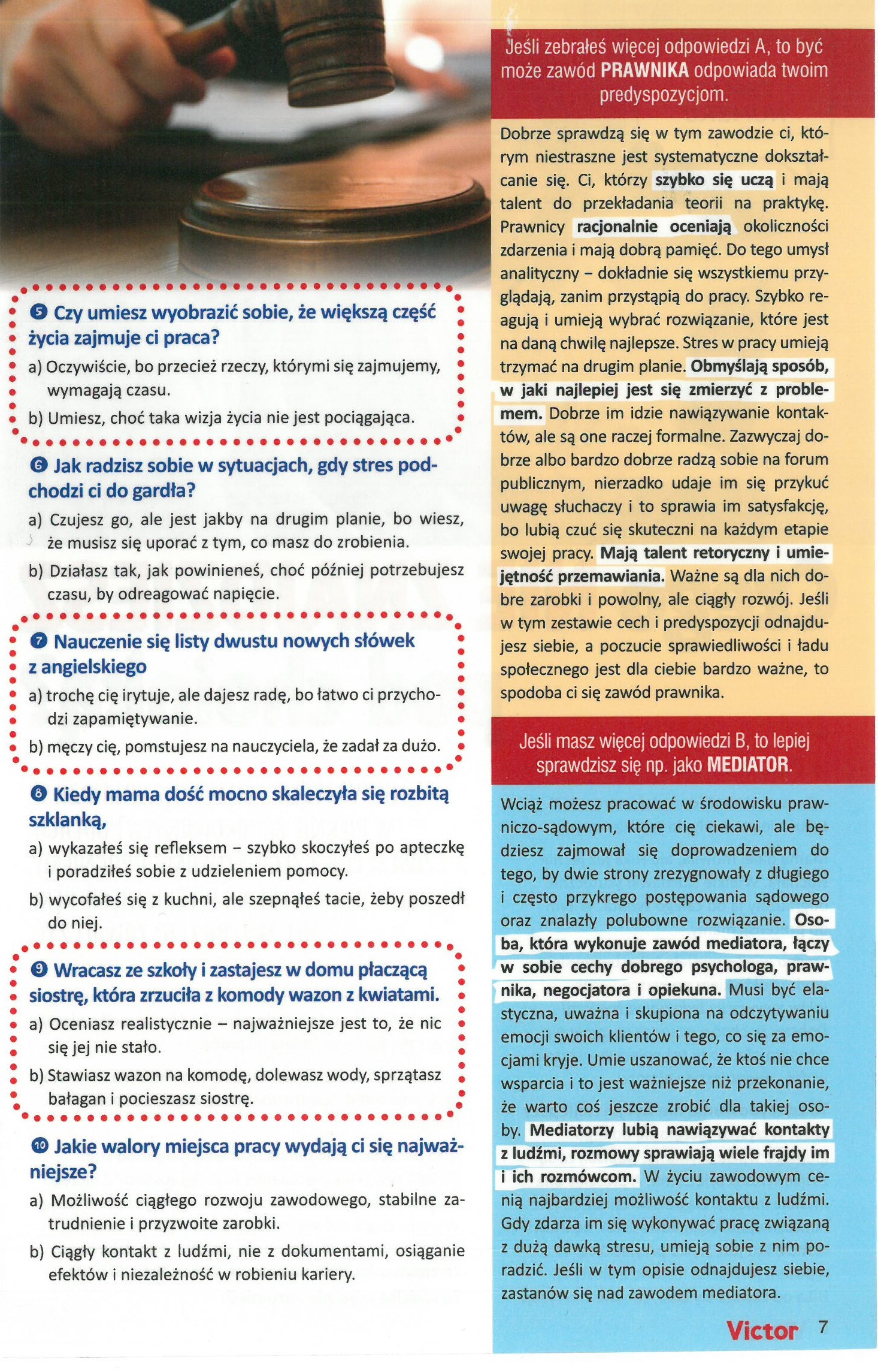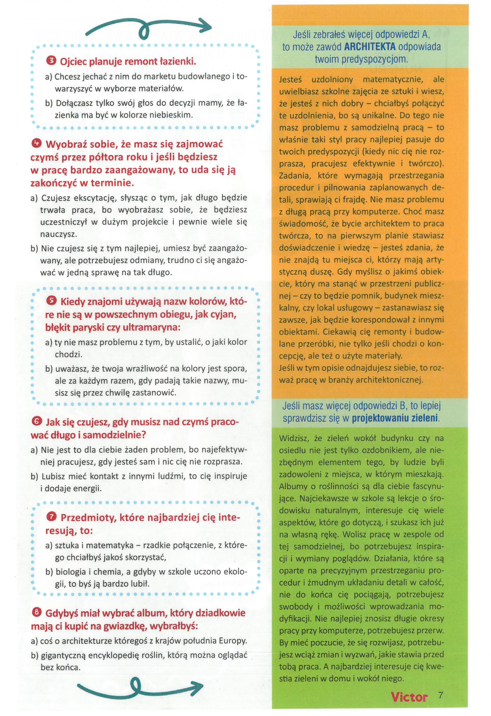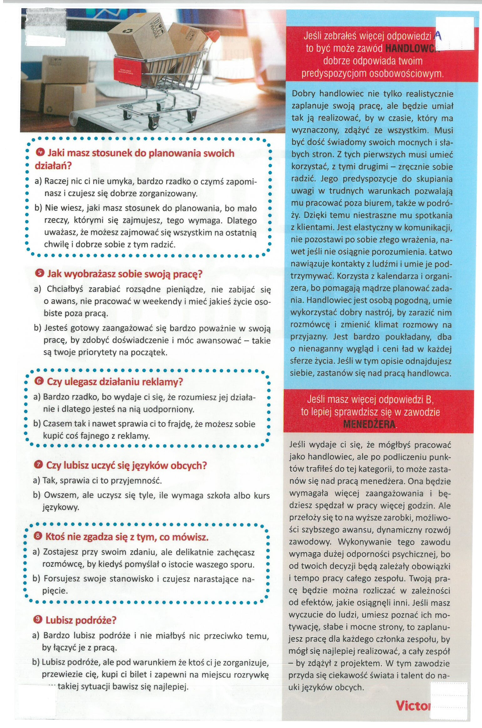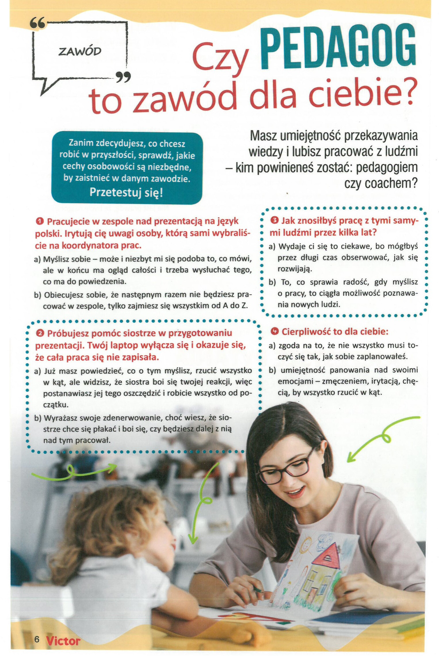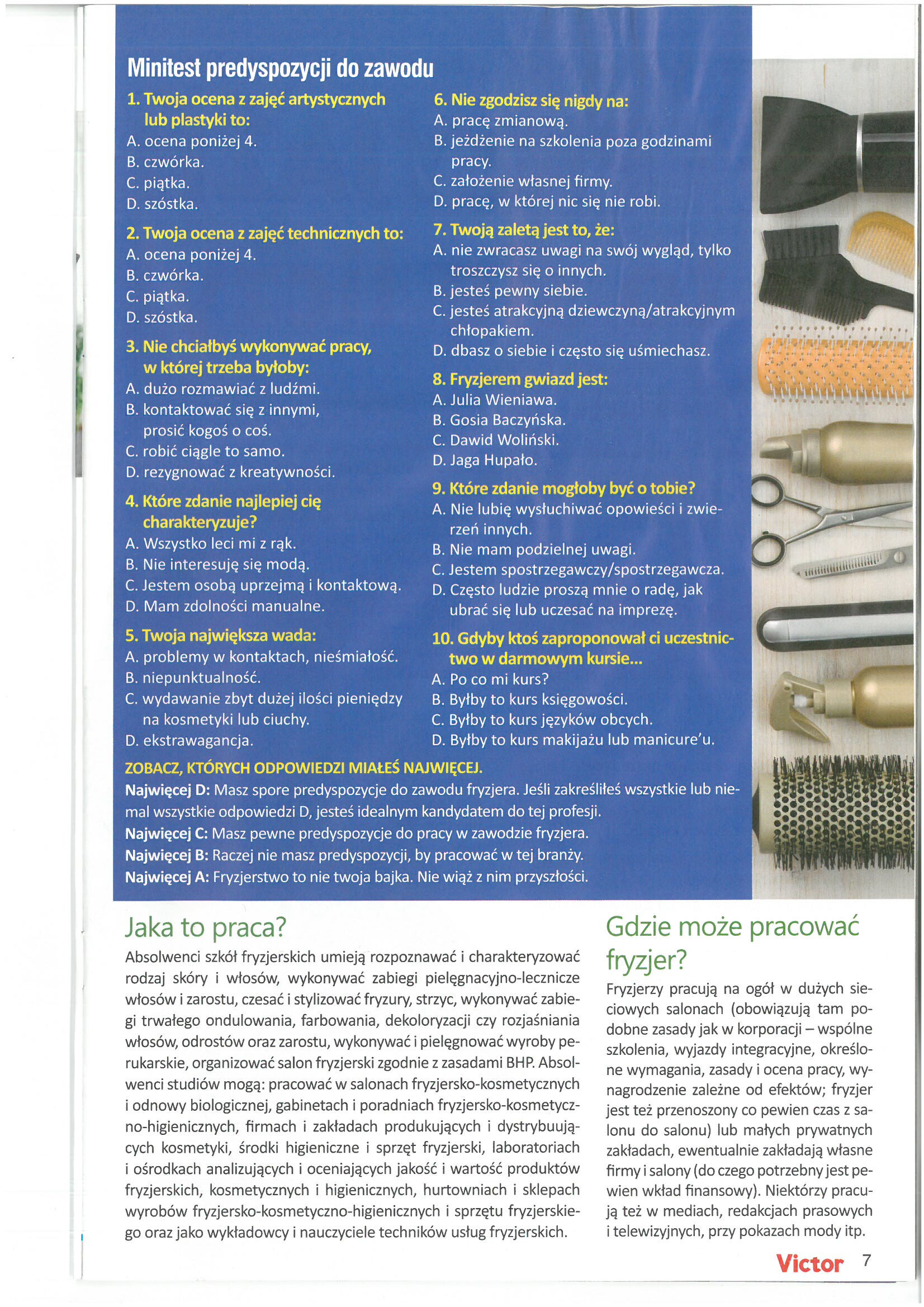 Jeśli rozważasz wybór szkoły, to mogą pomóc Ci testy predyspozycji zawodowych, które dzięki wydawnictwu Victor prezentujemy poniżej. Możesz wybrać interesujące Cię zawody umieszczone w załączonych grafikach i zrobić testy. Życzymy powodzenia i dobrej zabawy.