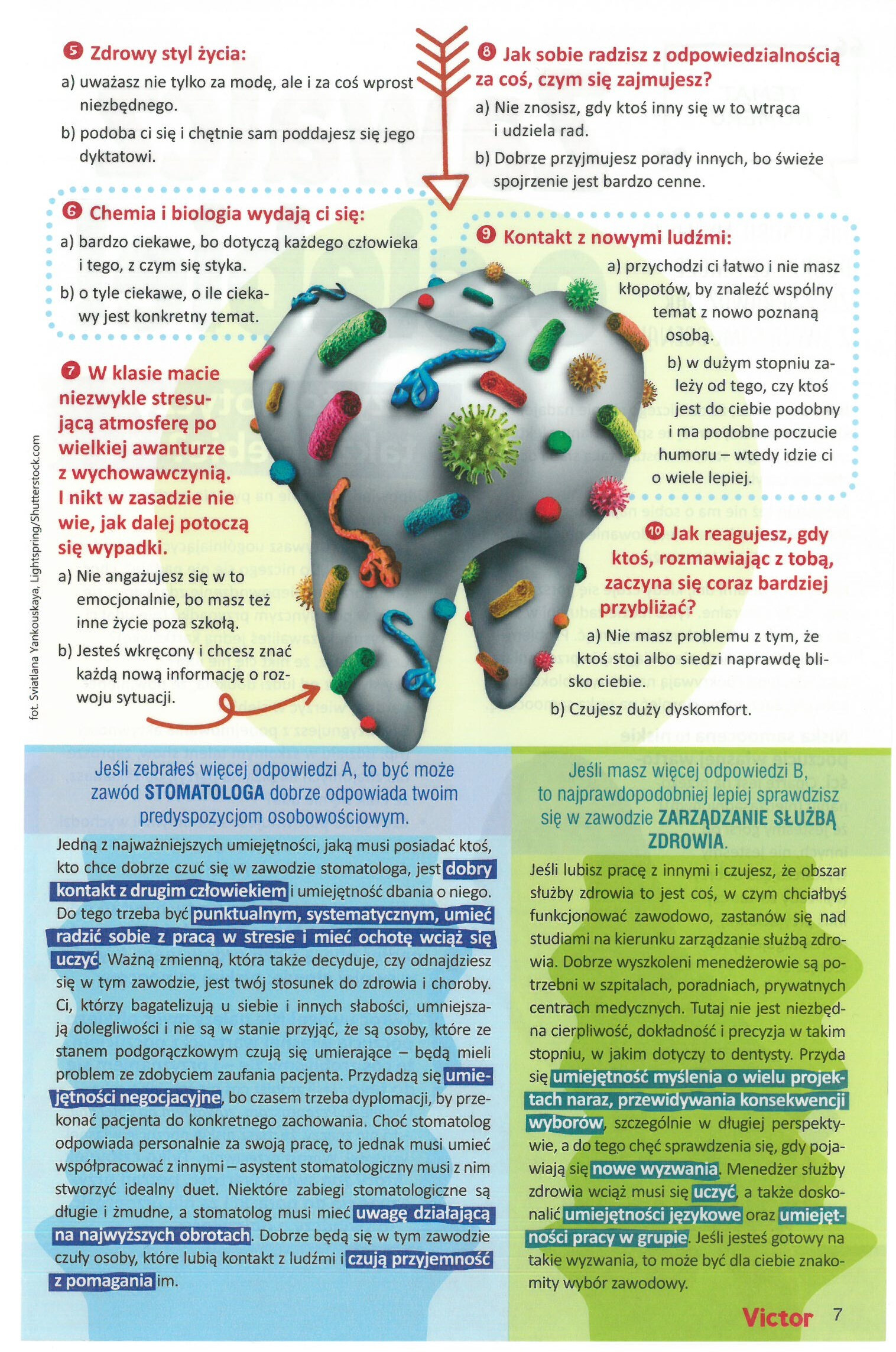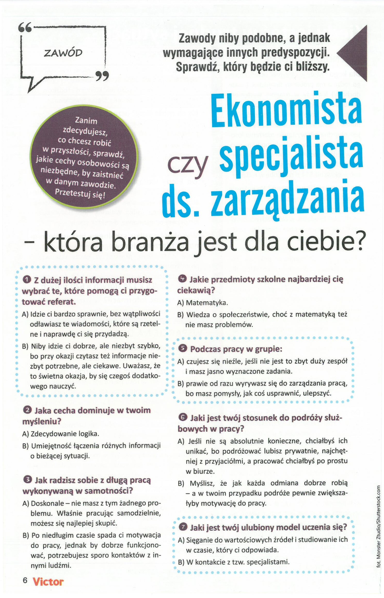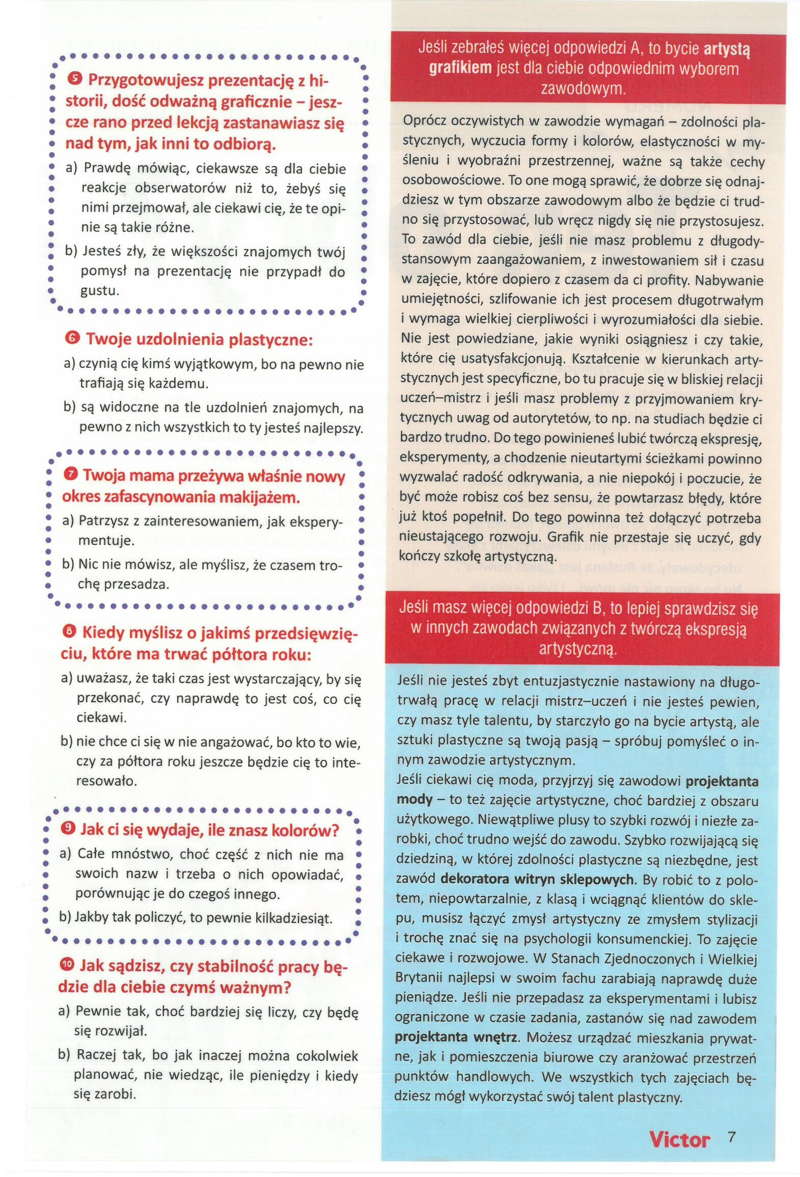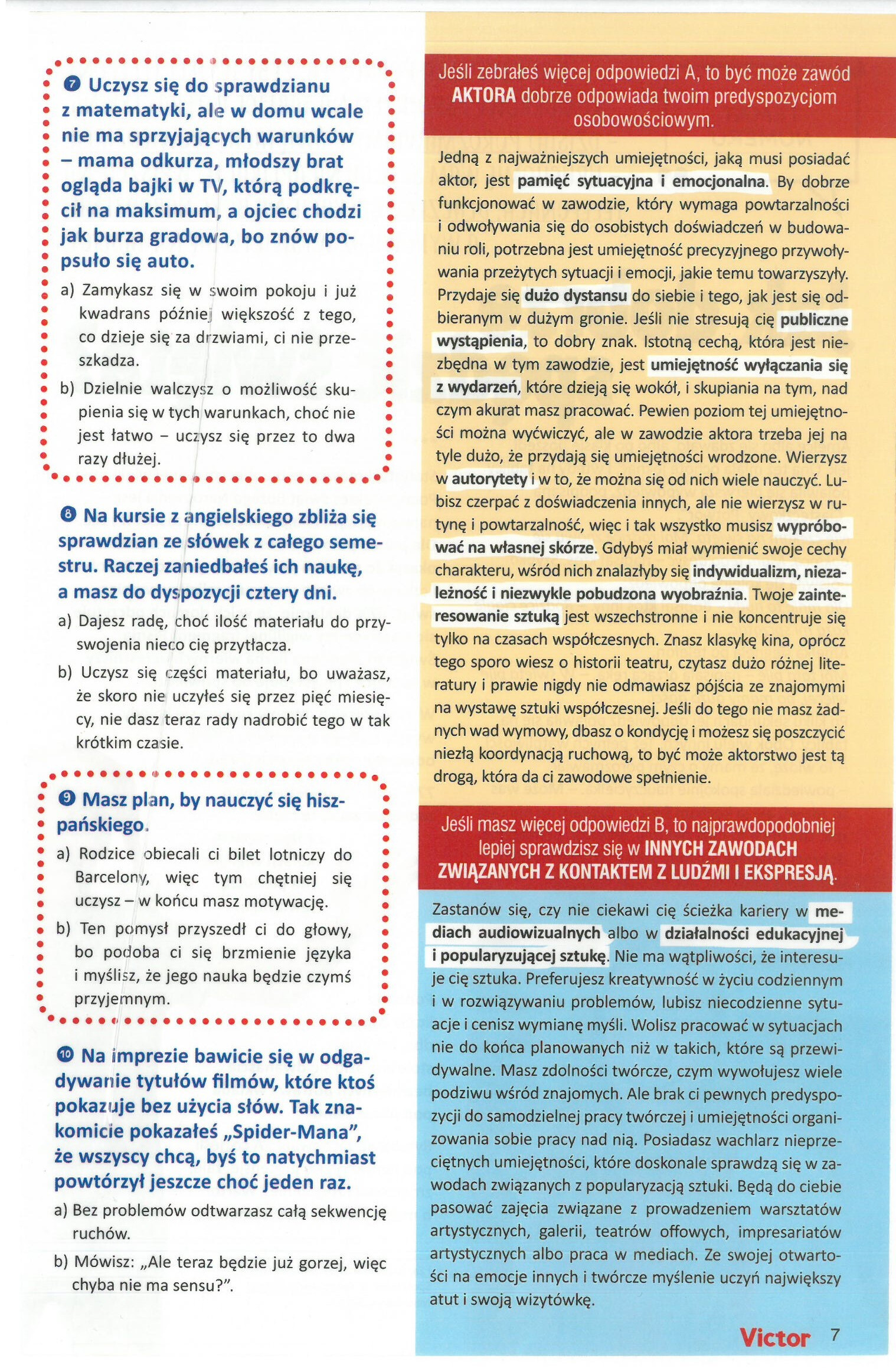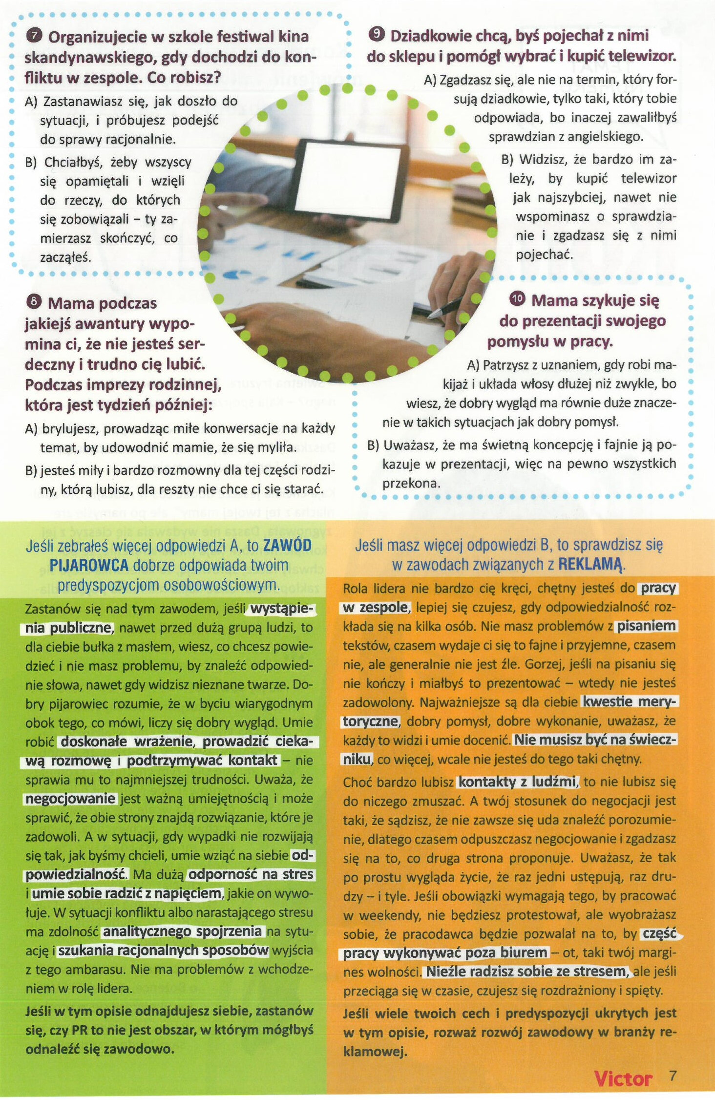 Jeśli rozważasz wybór szkoły, to mogą pomóc Ci testy predyspozycji zawodowych, które dzięki wydawnictwu Victor prezentujemy poniżej. Możesz wybrać interesujące Cię zawody umieszczone w załączonych grafikach i zrobić testy. Życzymy powodzenia i dobrej zabawy.