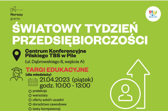 W dniu 21 kwietnia 2023 r. odbyły się TARGI EDUKACYJNE, które są elementem Światowego Tygodnia Przedsiębiorczości realizowanego w ramach przedsięwzięcia „Przedsiębiorcza Piła - Piła na start: organizacja wydarzeń promujących przedsiębiorczość dla młodzieży”.