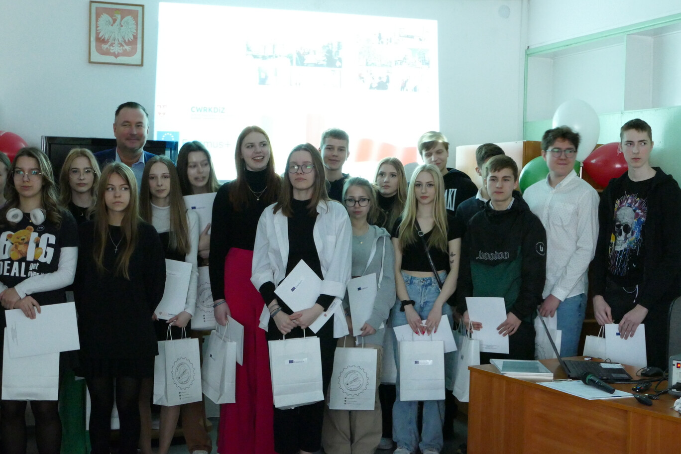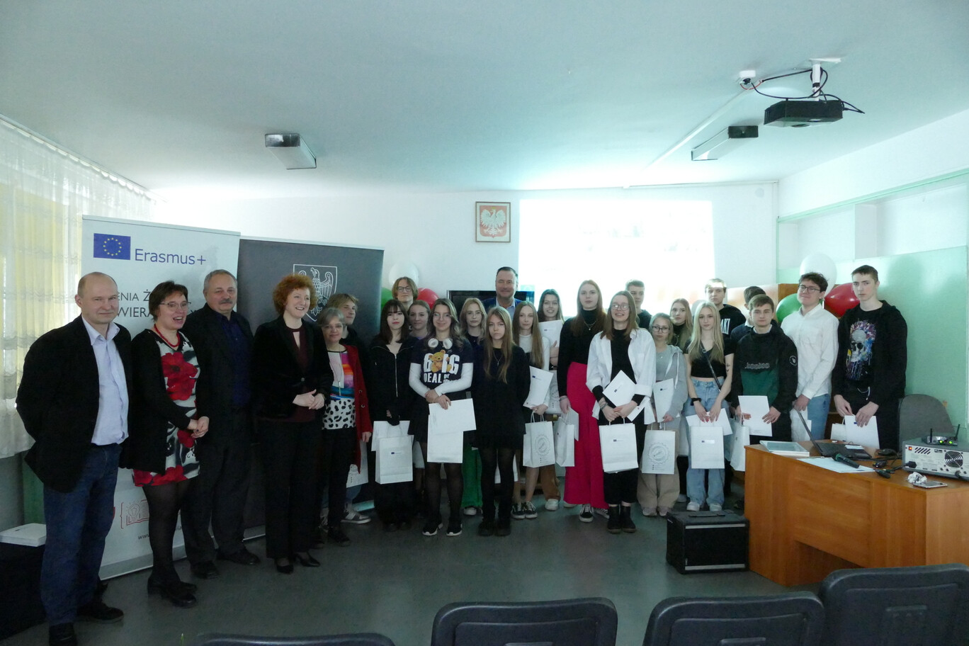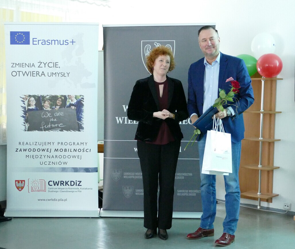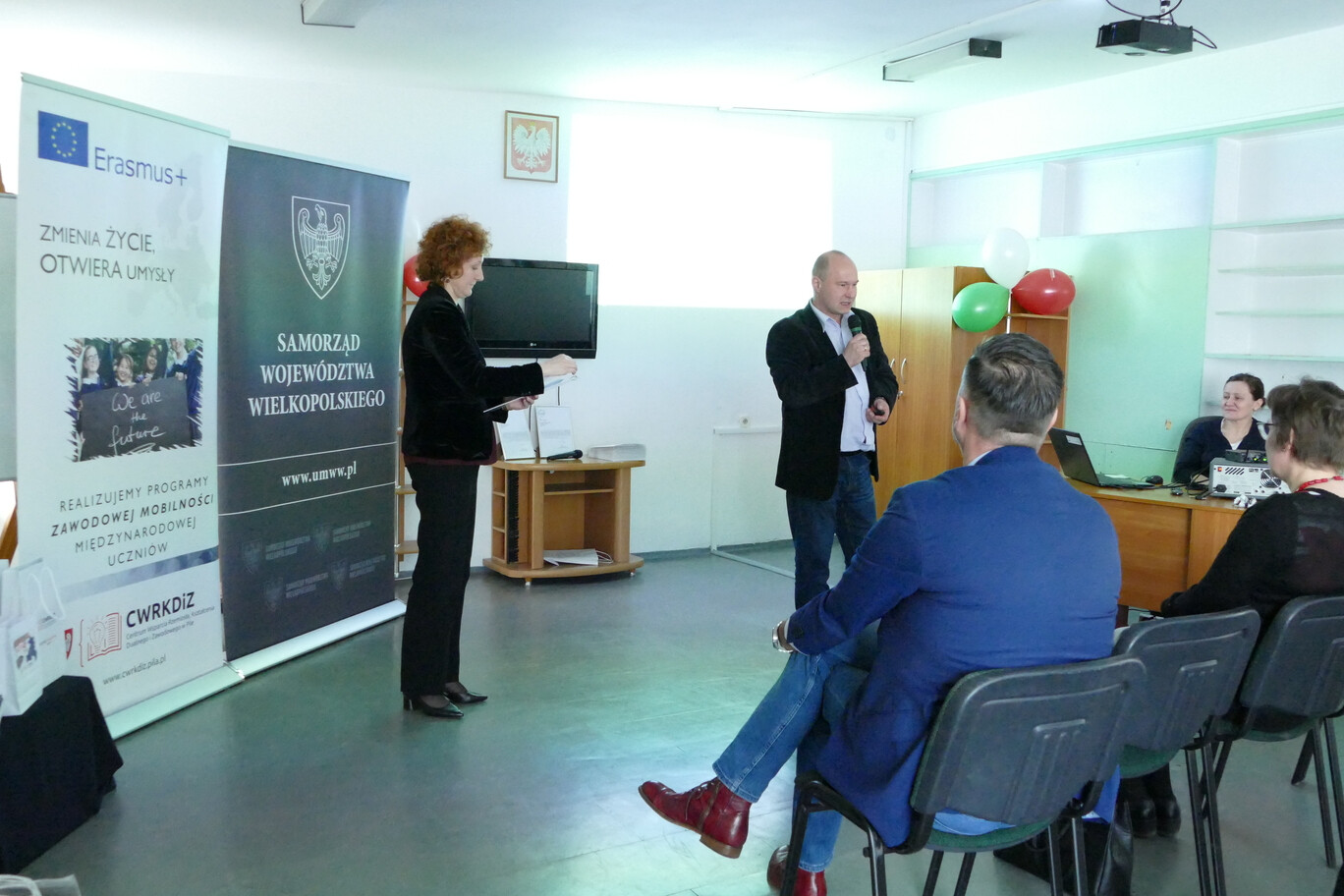 Podczas Dnia Włoskiego w dniu 09.04.2022 r. Dyrektor CWRKDiZ w Pile Ewa Krupka-Zaręba wręczyła uczniom zaświadczenia o udziale w projekcie. Przekazano podziękowania instytucji i organowi prowadzącemu szkołę a także osobom bezpośrednio zaangażowanym w realizację wyjazdu, a byli to m.in. – Dyrektor ZSE Pani Magdalena Michalska, opiekunowie grupy uczniów: Pani Anna Michalska, Pan Henryk Liszkiewicz, Pan Marek Kamiński (jednoczesny Członek Zarządu Powiatu) oraz szkolny koordynator projektu Pani Anita Taterka.