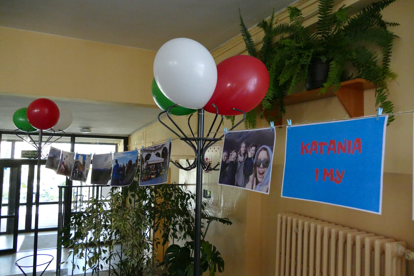 Młodzież przygotowała multimedialną prezentację z pobytu na praktykach a jeden z opiekunów – Pan Henryk Liszkiewicz zaprezentował rys historyczny i turystyczny Katanii. Na zdjęciach i plakatach w holu można było obejrzeć zdjęcia młodzieży z Sycylii. Uczennice i uczestniczki wyjazdu wykonały kilka utworów w języku włoskim, a na koniec spotkania była włoska, kulinarna niespodzianka – poczęstunek w formie pizzy.