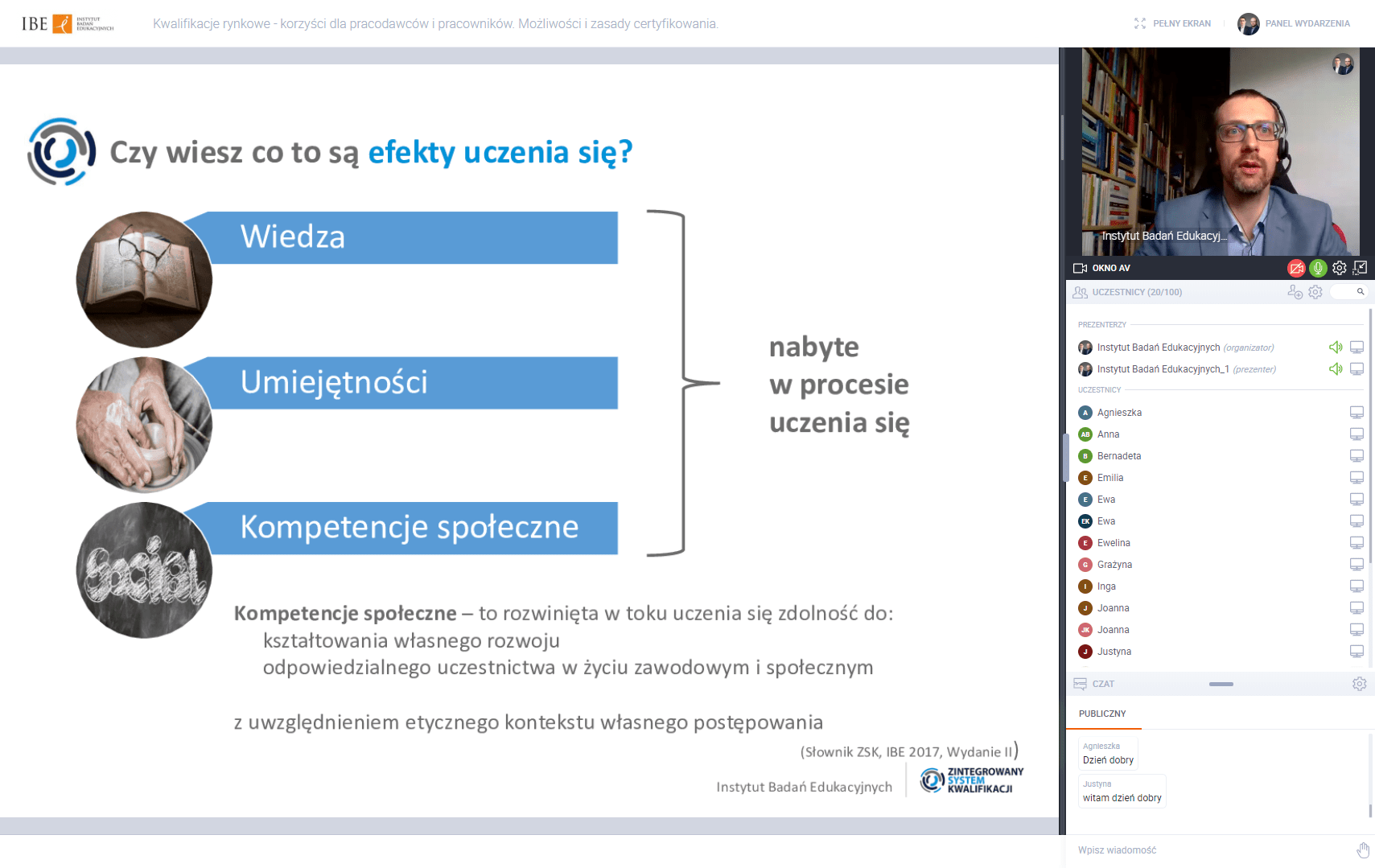 Zorganizowane przez nasze Centrum i przy współudziale IGPW w Pile spotkanie robocze pt. „Kwalifikacje rynkowe - korzyści dla pracodawców i pracowników odbyło się 18.06.2020 w wirtualnej sali. Spotkanie poprowadzili przedstawiciele Instytutu Badań Edukacyjnych Sławomir Szymczak i Jan Kosmowski.