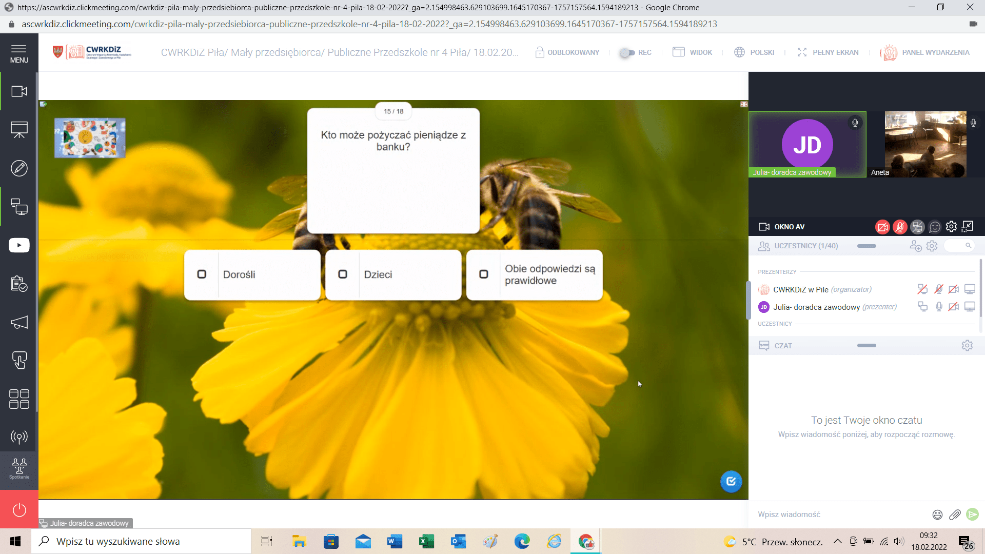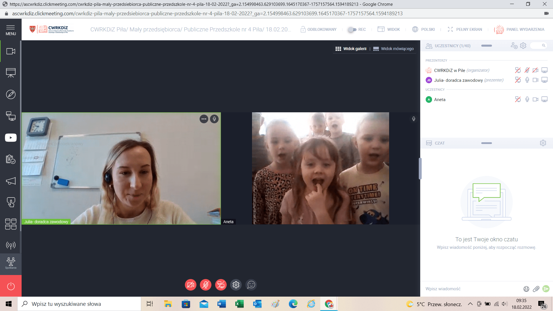 Dnia 18.02.2022 r. doradca zawodowy CWRKDiZ w Pile Julia Kuśniar- Zielińska odwiedziła wirtualnie Publiczne Przedszkole nr 4 w Pile, przeprowadzając warsztat pt. „Mały przedsiębiorca- Zawodowe brzdące”. Spotkaliśmy się z grupą Zajączków, które świetnie poradziły sobie w odpowiadaniu na pytania z testu wiedzy