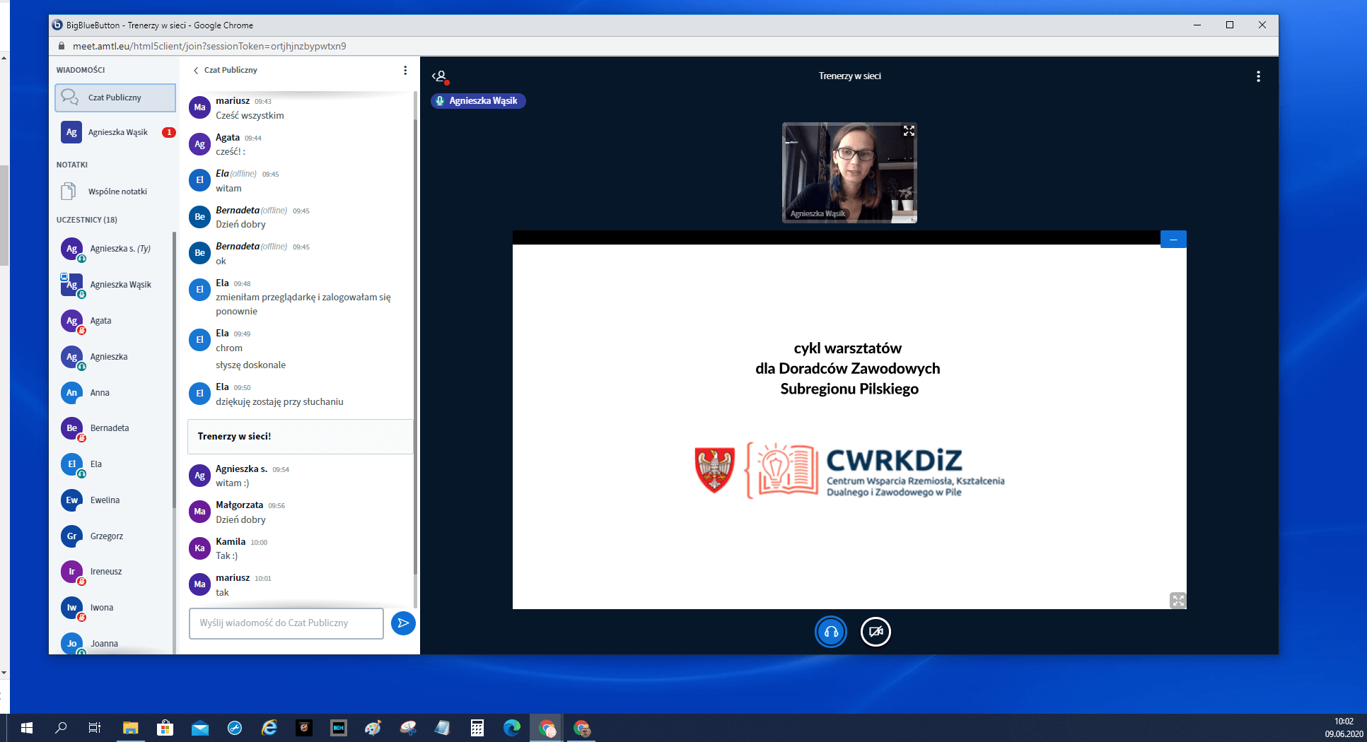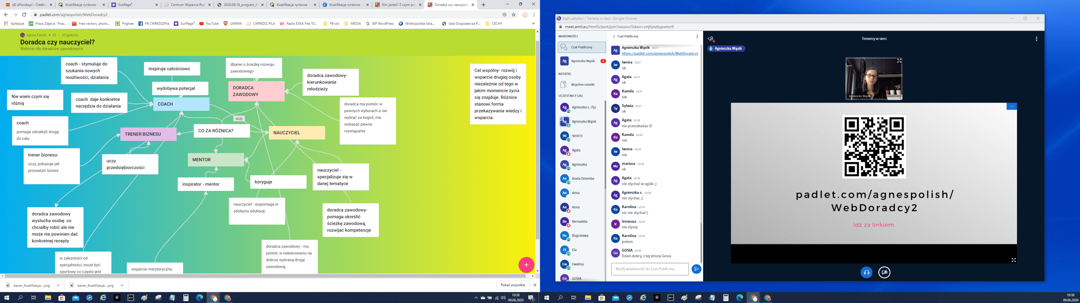 Agnieszka Wąsik — trener biznesu, coach, lektor języków obcych, doktor nauk humanistycznych poprowadziła webinar dla doradców Sieci Doradców Zawodowych Subregionu Pilskiego 09.czerwca br. Było to kolene spotkanie z cyklu warsztatów dla doradców zawodowych, zrzeszonych w Sieci Doradców Zawodowych Subregionu Pilskiego. Udział w nim wzięło 26 osób. Zajęcia poświęcone były praktycznemu zastosowaniu narzędzi internetowych, przydatnych w pracy doradcy zawodowego m.in. padlet.com, mapowanie myśli, chmury wyrazowe, answergarden.ch, wordart.com, trello.com. Dziękujemy wszystkim uczestnikom za aktywny udział w tym webinarze.