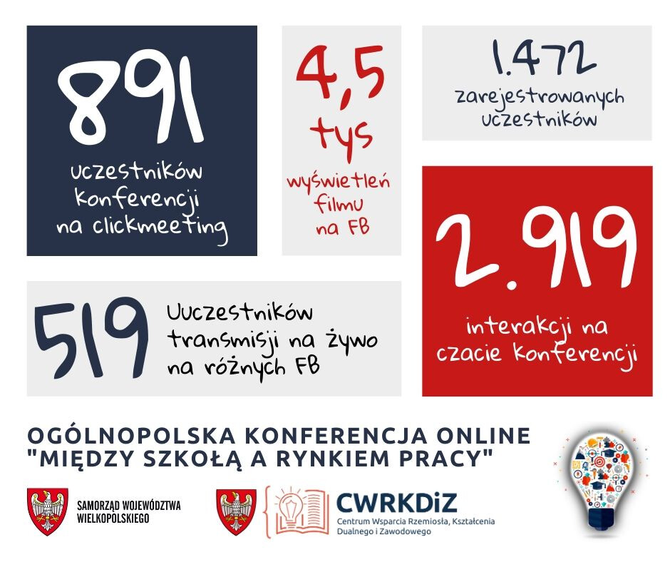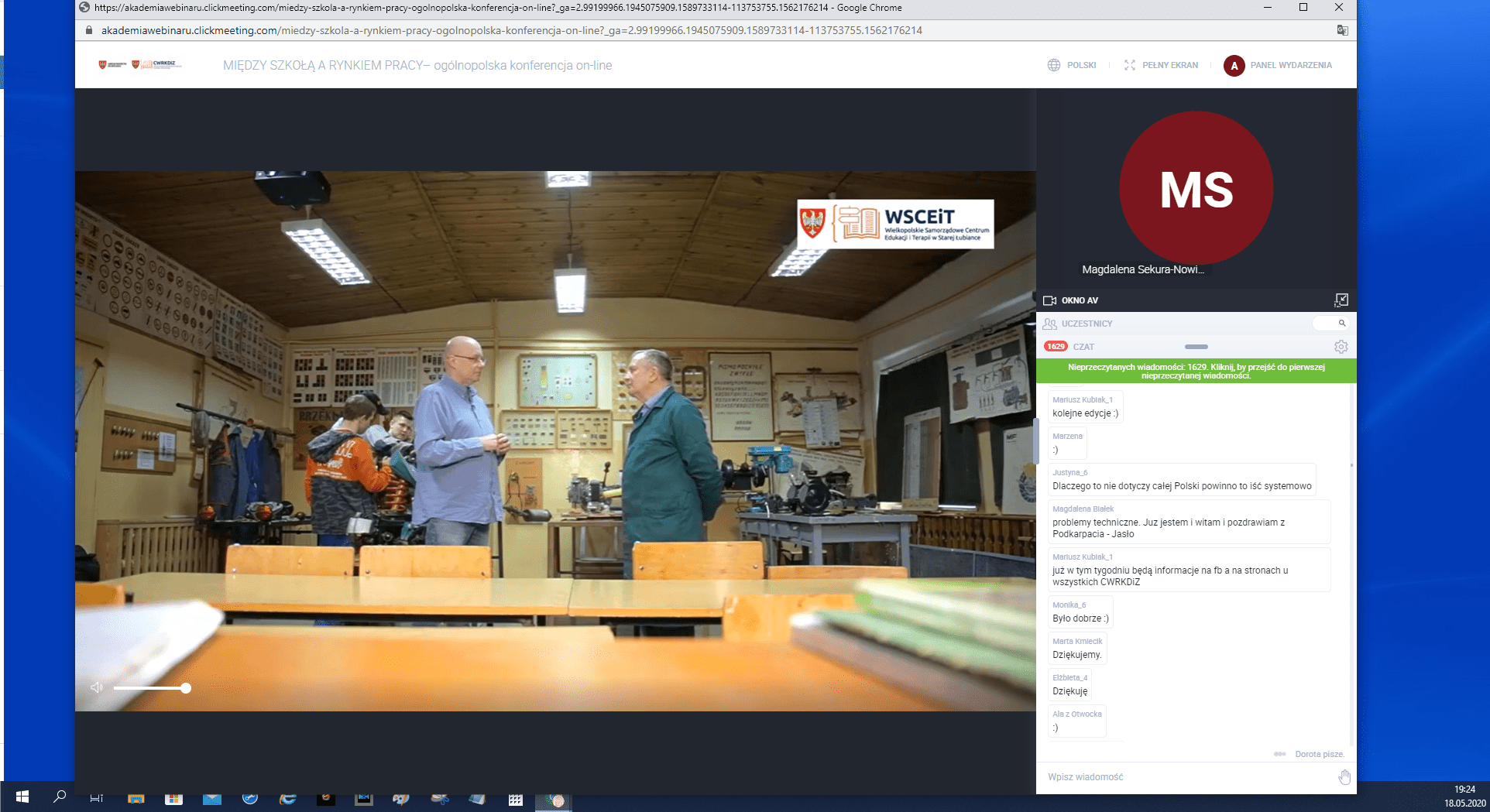 Ogólnopolska konferencja online „MIĘDZY SZKOŁĄ A RYNKIEM PRACY” jest już za nami. W poniedziałek, nietypowo, bo w godzinach popołudniowych, na 3,5 godziny wielkopolskie Centra Wsparcia Rzemiosła, Kształcenia Dualnego i Zawodowego wraz z Akademią Webinaru zatrzymały w sumie ponad 1,5 tysiąca osób przed ekranami swoich laptopów, tabletów i smartfonów.