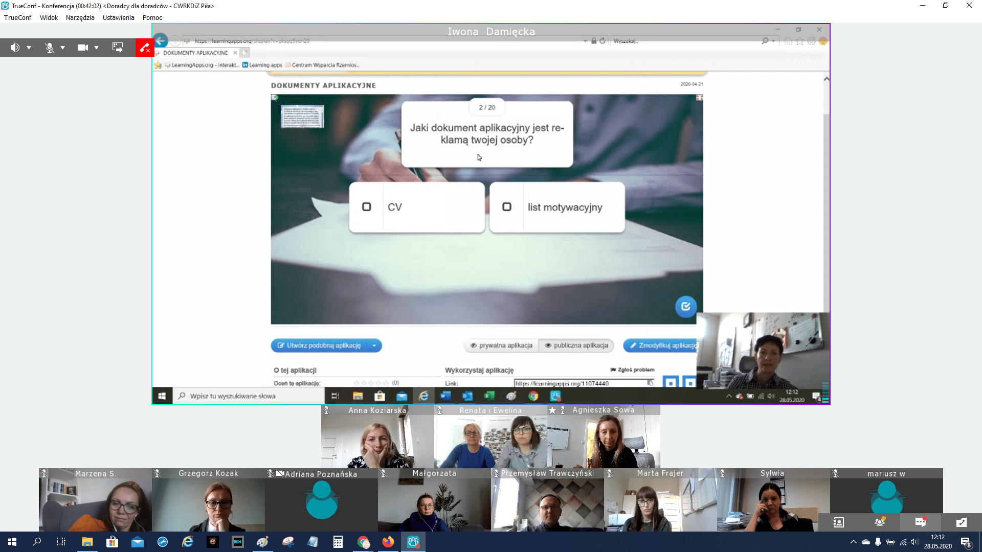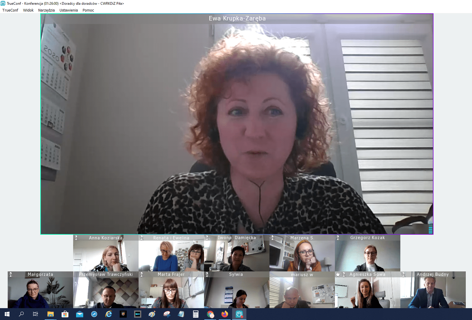W drugiej części uczestnicy przełączyli się na platformę TrueConf gdzie po przywitaniu przez dyrektora CWRKDiZ w Pile we wspólnym, wąskim gronie zostały poruszone aktualne problemy w pracy doradców zawodowych, związane z ograniczeniami wynikającymi z sytuacji epidemiologicznej w kraju. Doradcy zawodowi ze wszystkich centrów zaprezentowali swoje osiągnięcia, propozycje i sposoby radzenia sobie w tej trudnej i nieprzewidywalnej wcześniej sytuacji. Podczas spotkania zostały zaprezentowane narzędzia online stworzone przez doradcę zawodowego CWRKDiZ w Pile - p. Iwonę Damięcką.