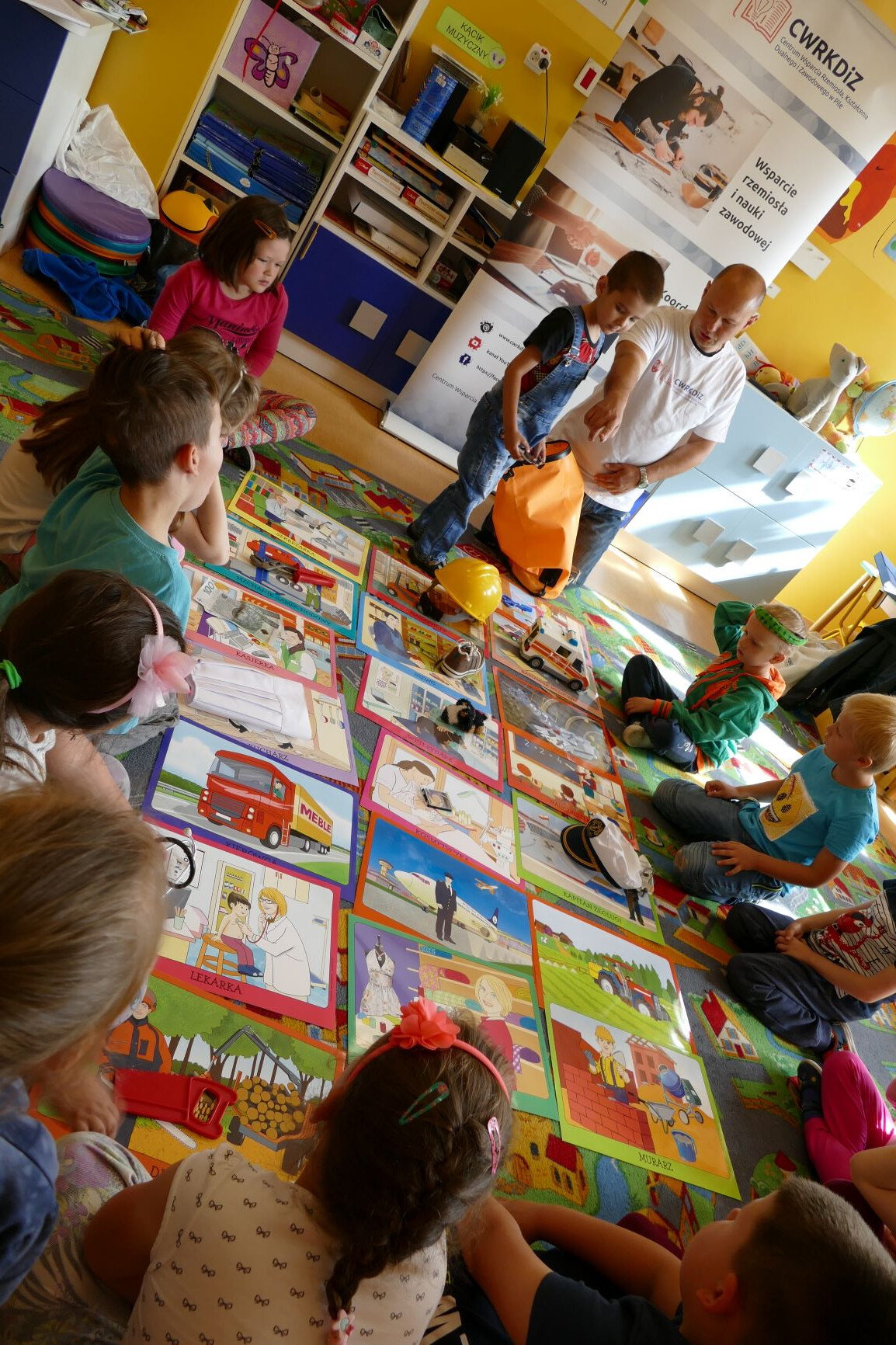 Dzieci z Grupy Słoneczka i Żabki uczyły się nazw zawodów oraz atrybutów poszczególnych profesji. W nagrodę za aktywność otrzymały odblaskowe zawieszki oraz książki ''Zawody czyli kim możesz zostać", z której będą mogły nadal się uczyć o świecie zawodów. Dziękujemy za wspólne działanie.
