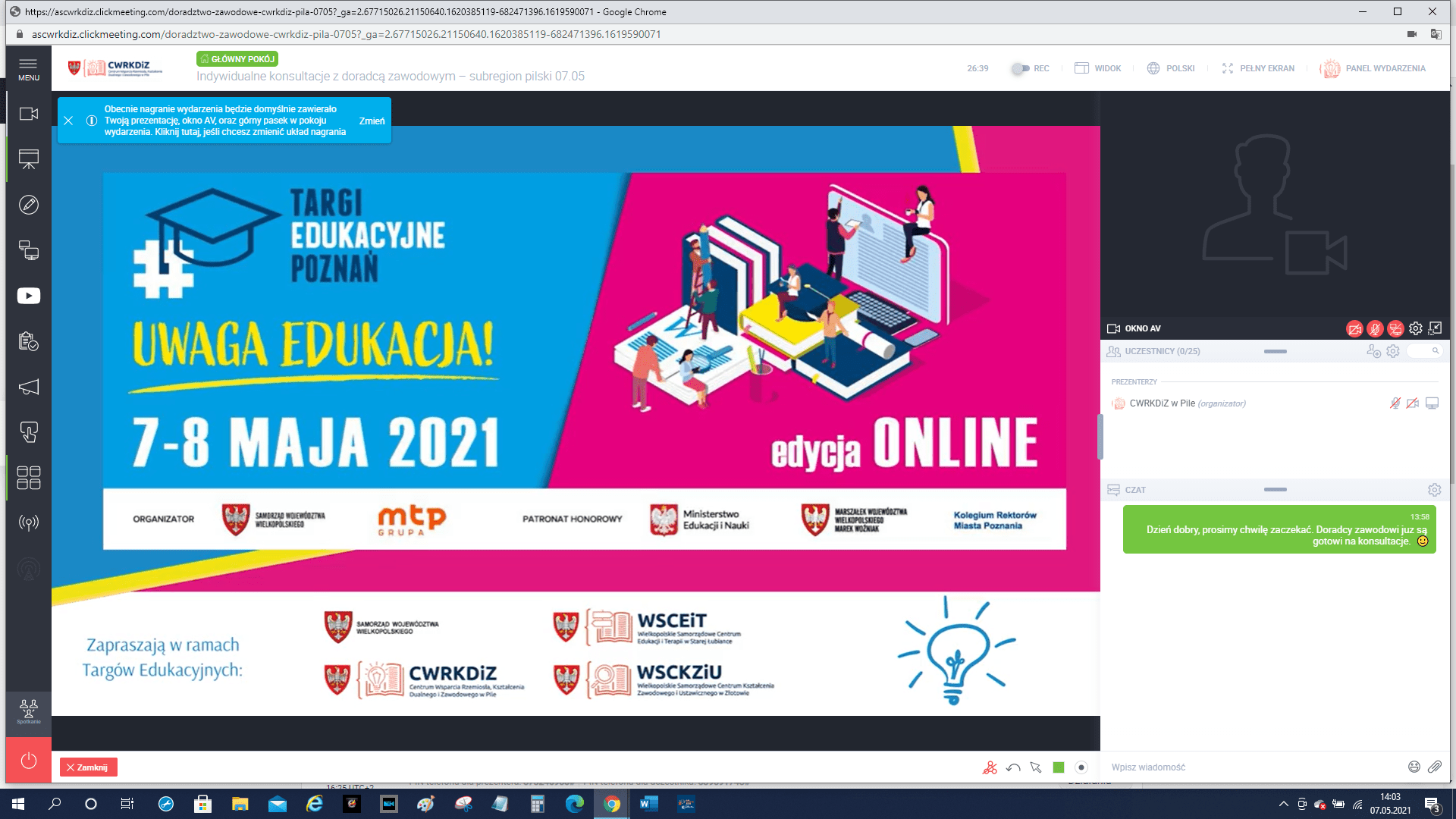 W dniach 7-8 maja odbyły się Targi Edukacyjne pod hasłem Uwaga Edukacja! Organizatorami wydarzenia byli: Departament Edukacji i Nauki Urzędu Marszałkowskiego Województwa Wielkopolskiego i Grupa MTP. Patronatem Honorowym wydarzenie objęli: Ministerstwo Edukacji i Nauki, Marszałek Województwa Wielkopolskiego Marek Woźniak oraz Kolegium Rektorów Miasta Poznania. Gratulujemy Organizatorom podjęcia się wyzwania zorganizowania tego wydarzenia z wieloletnią tradycją w standardach świata wirtualnego.