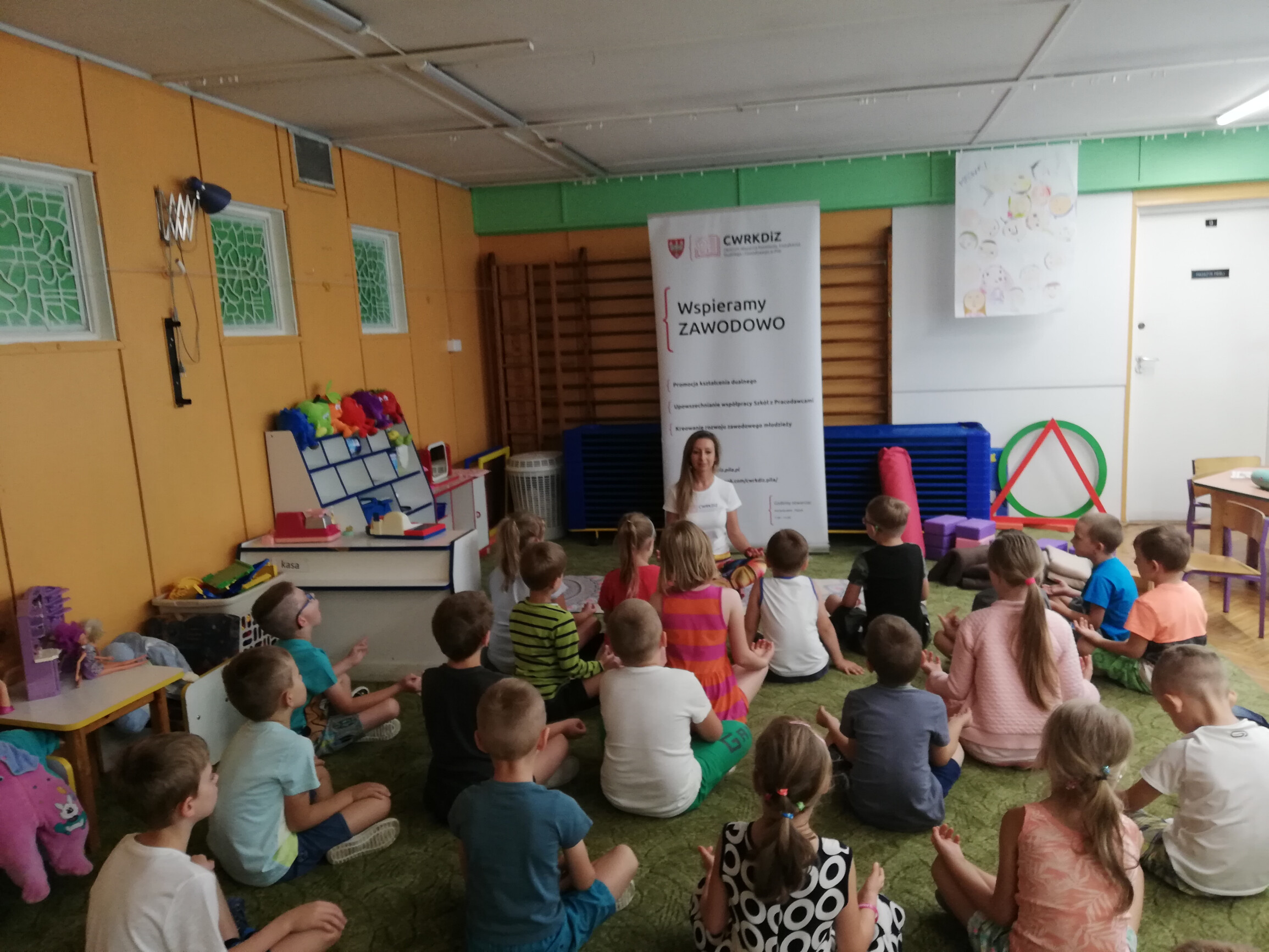 Podczas zajęć pracownicy CWRKDiZ w Pile zapoznawali dzieci z zawodami #prozdrowotnymi. Przedszkolaki bardzo ciekawie odpowiadały na pytania czym jest zdrowie, jak o nie dbać, co należy robić dla lepszego zdrowia i samopoczucia. Dowiedzieliśmy się też co dzieci robią w tym kierunku. Były zagadki dotyczące zawodów związanych z rekreacją, sportem i różnymi formami ruchu, a także dbaniem o zdrowie. Dzieci dobrze sobie poradziły z odgadywaniem zawodów – zagadek z książki „Zawody – czyli kim możesz zostać” - takich jak np. tancerz, akrobata, dietetyk czy trener sportowy. Praktyczna część zajęć to spotkanie z zawodem – #InstruktorZajęćJogi. Pani Agnieszka –Instruktor jogi i relaksacji - opowiedziała czym jest joga, jakie są jej korzyści dla zdrowia i pokazała dzieciom jak wygląda jej praca jako instruktor, którą wykonuje z pasją. Zaprezentowała uczestnikom niektóre akcesoria jakich używa podczas zajęć. Nie obyło się oczywiście bez wspólnego ćwiczenia. Dzieci chętnie poznawały kolejne asany, ćwiczyły proste plecy i spokojny oddech aby tą praktyką także uczyć się wyciszania i relaksowania, które pozytywnie wpływa na rozwój dzieci, na ich koncentrację, a także na lepsze relacje. Na koniec zajęć jogi był krótki relaks w pozycji leżącej i ćwiczenie „Cisza”, któremu dzieci po aktywnych zajęciach poddały się bez problemu. Aby przez wakacje poznawać nadal świat zawodów, dzieci otrzymały kolorowanki o tej tematyce. Dziękujemy za spotkanie i współpracę.