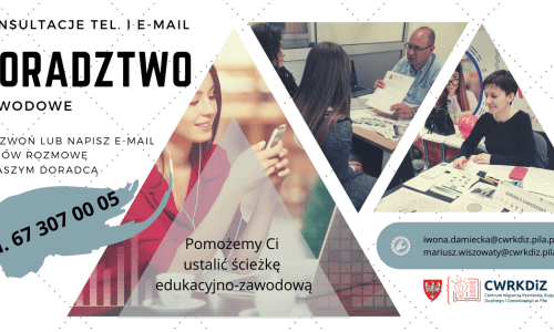 Dostosowując się do aktulnych możliwości oraz potrzeb, nasi doradcy zawodowi proponują Wam bezpłatne konsultacje zawodowe bez wychodzenia z domu. Zapraszamy do rozmowy telefonicznej lub konsultacji e-mail ucznia, absolwenta lub rodzica w tematach: