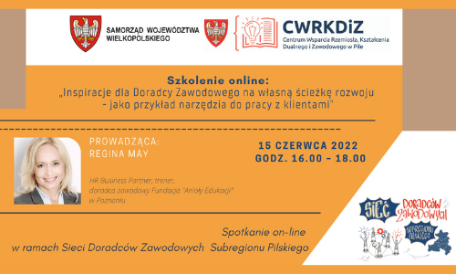 16:15 - 18:00 Szkolenie: „Inspiracje dla Doradcy Zawodowego na własną ścieżkę rozwoju - jako przykład narzędzia do pracy z klientami” - Regina May, HR Business Partner, trener, doradca zawodowy Fundacja "Anioły Edukacji" w Poznaniu