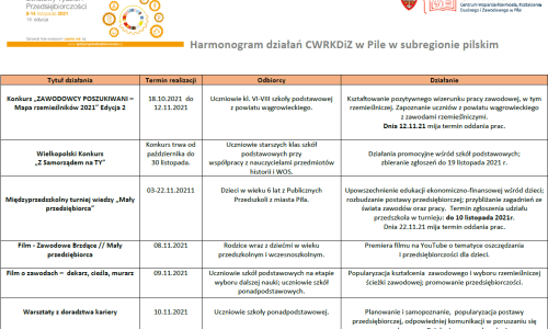| Konkurs „ZAWODOWCY POSZUKIWANI – Mapa rzemieślników 2021” Edycja 2 | 18.10.2021 do 12.11.2021 | Uczniowie kl. VI-VIII szkoły podstawowej z powiatu wągrowieckiego. |