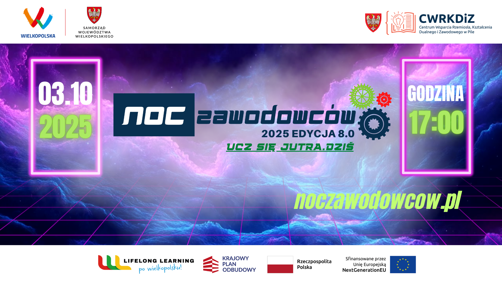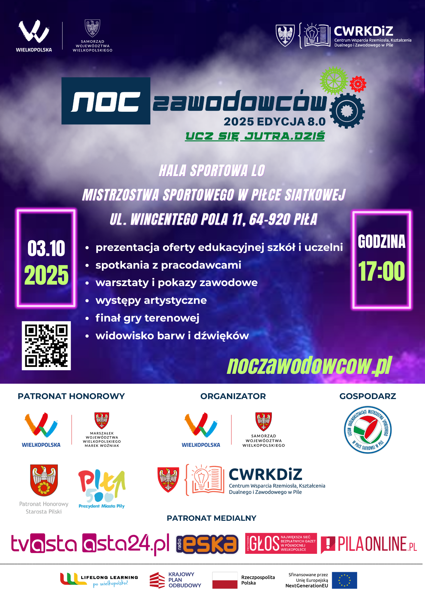 Dnia 3 października o godz. 17:00 w hali sportowej LO MS w Piłce Siatkowej przy ul. W. Pola 11 w Pile odbędzie się NOC ZAWODOWCÓW 2025 Edycja 8.0 pt. "Ucz się jutra. Dziś" objęta patronatem honorowym Marszałka Województwa Wielkopolskiego, Starosty Pilskiego oraz Prezydenta Miasta Piły.